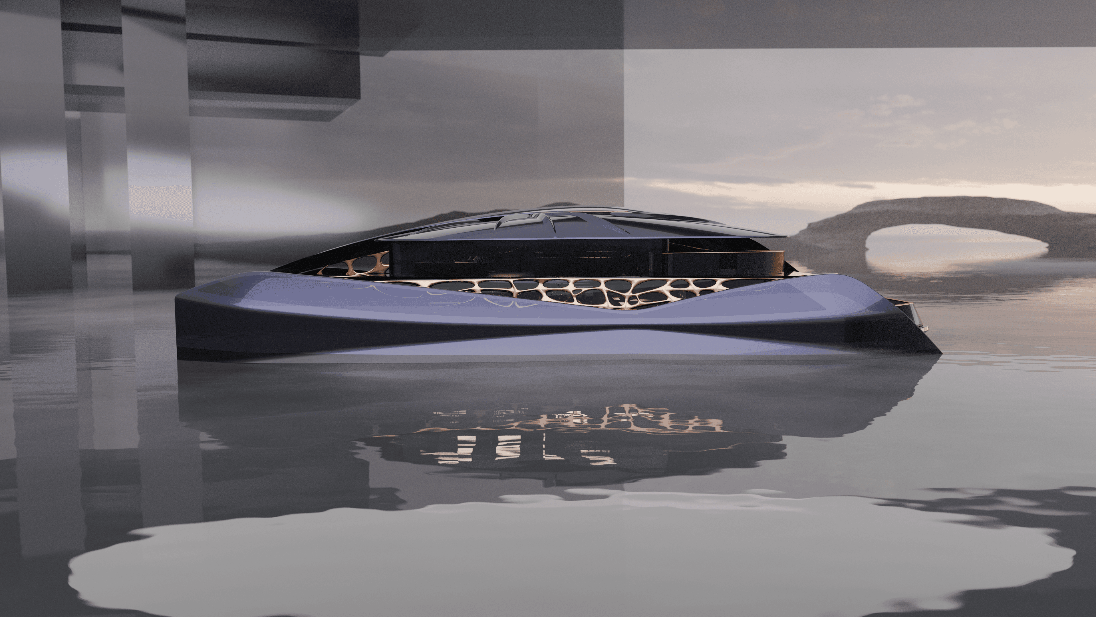 Tramuntana explores how natural forces can be translated into contemporary nautical form. Inspired by the Tramuntana wind - a defining element of the Mediterranean coastline - the project investigates how pressure, direction, and movement can inform exterior geometry and surface logic. The catamaran is conceived as a sculptural vessel, where form is driven by flow rather than static composition. Its exterior language merges precision, tension, and performance-oriented geometry with organic continuity and spatial fluidity, influenced by Mediterranean landscapes and Gaudí's structural approach.